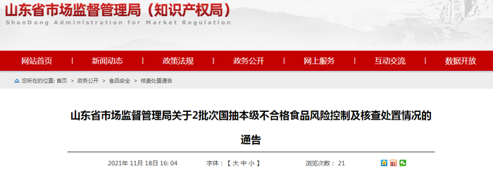 山东省市场监督管理局关于2批次国抽本级不合格食品风险控制及核查处置情况的通告