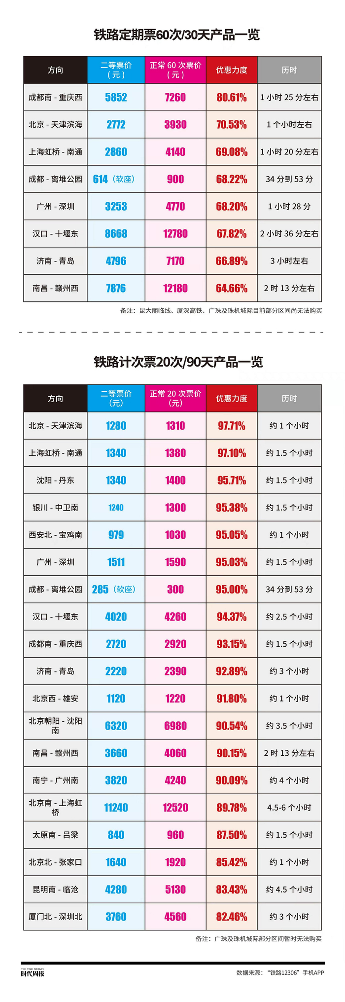 据时代周报记者梳理,当前铁路部门销售的31种月票产品中,30天可出行60次的定期票普遍打6-7折,而90天可出行20次的计次票普遍打9折左右。