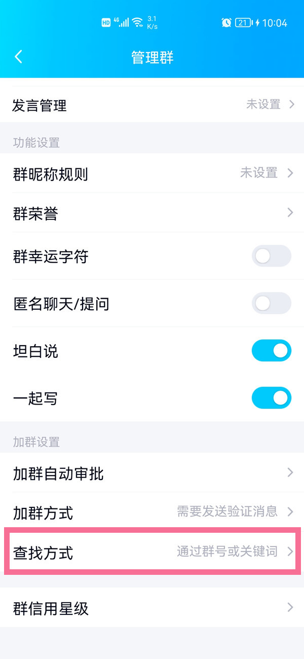 2、下滑找到加群选项,点击【查找方式】。