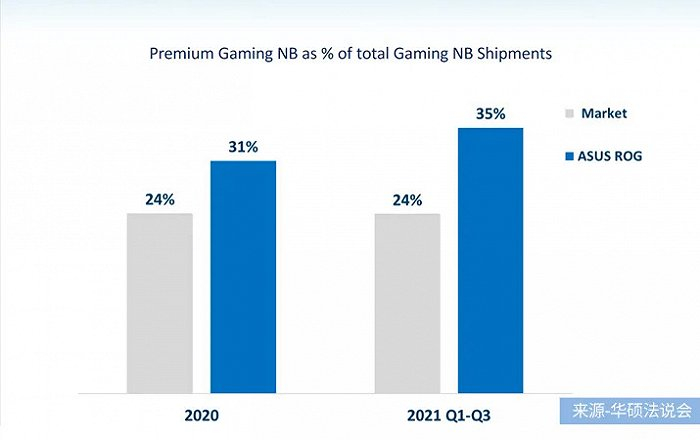 2020年,其电竞本以24%本市占率达到全球出货量第一,其中ROG在高端电竞本市占率达31%。2021年前三季度市占率继续上升,游戏本市占率保持24%,ROG在高端电竞本市占率达35%。
