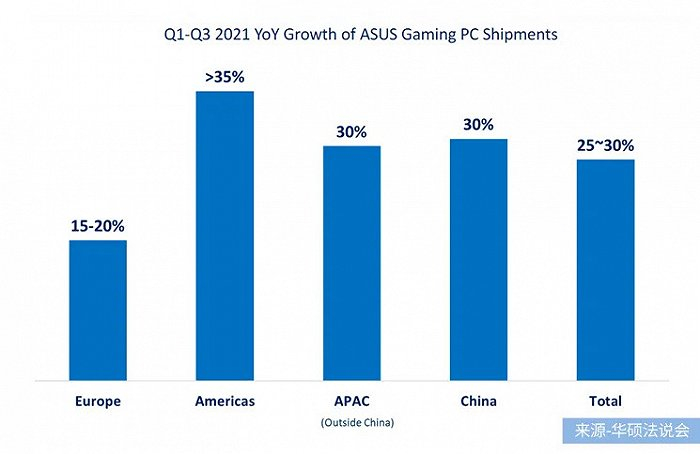 华硕游戏本的增速强势,2021年前三季度华硕游戏本增速达25%-30%。其中北美地区增速最高,为超35%;增速最低的为欧洲地区,为15%-20%。