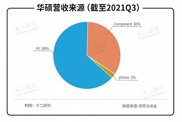 据华硕第三季度法说会数据显示,目前华硕营收分为三大部分,分别为个人电脑、电脑配件、手机,分别占比68%,30%,2%。其中,个人电脑是华硕业绩的最大来源。