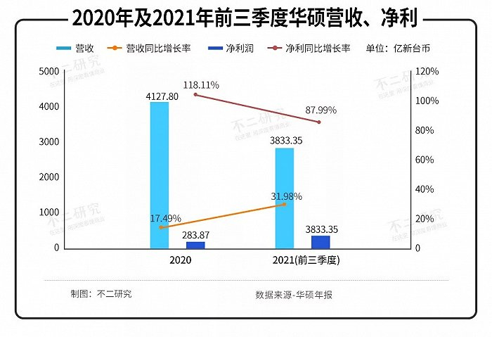 得益于PC行业整体复苏,华硕2020年和2021前三季度营收分别为4127.80亿新台币及3833.35亿新台币,同比增长17.49%和31.98%;同期,净利润为283.87亿新台币、339.36亿新台币,同比增长118.11%和87.99%。