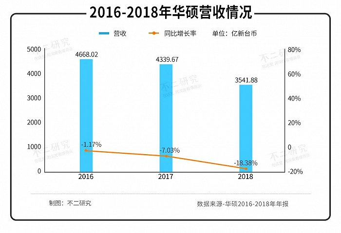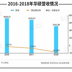 据华硕年报显示,2016-2018年华硕营收分别为4668.02亿新台币、4339.67亿新台币和3541.88亿新台币;同比增长率为-1.17%、-7.03%和-18.38%,呈逐年下滑趋势。