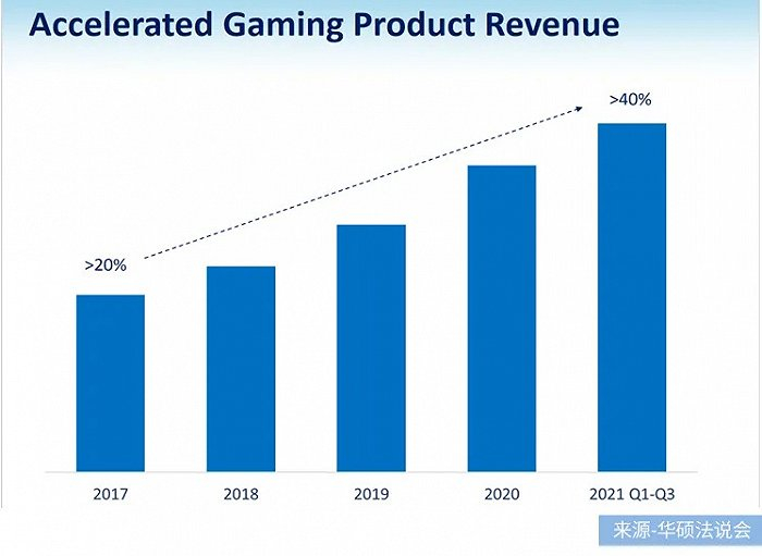 同时,电竞相关产品的利润占比在华硕的利润组成中越来越重要。据华硕财报法说会介绍,2017年,电竞产品利润占比仅20%左右,到2021年前三季度,电竞产品利润占比已超40%。