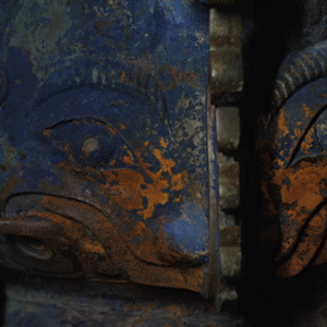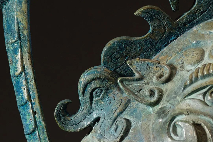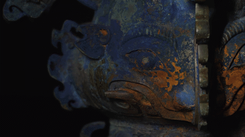 作为展览部的工作人员,我第一次去随州看文物、确定展品的时候,第一眼就觉得这件器物很特别。首先,它的“神面纹”和普通青铜器的兽面纹不一样,眼睛非常独特;另外,由于土质的关系,这件青铜器上的铜锈是泛蓝的,颜色也尤为好看。总之,方罍身上仿佛带有一种摄人心魄的美感,给我留下了深刻的印象。