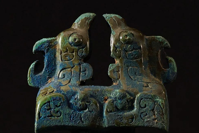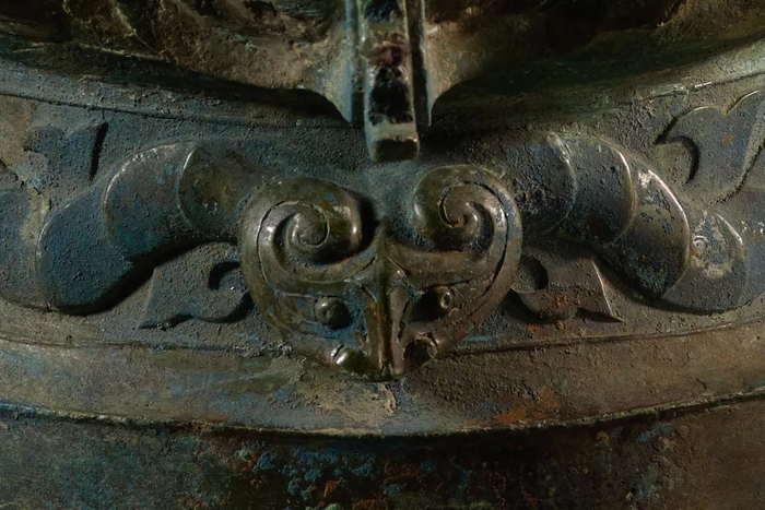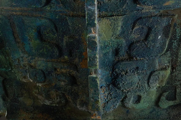 此外,方罍在制作上是非常严谨的。首先体现在其盖顶部的鸟形钮。铸造时,为了形成铸件内部的空腔,需要使用泥芯。在普通的青铜器中,泥芯头是会露在器表的。但在这件方罍的鸟形盖钮上,尽管露出的泥芯头是隐藏在器盖内侧的,从外观上无法直接看到,但在罍盖铸成后,泥芯头仍然被挖掉,并使用青铜液再次补铸,完美包裹住了内部的泥芯。这种严谨的制作技术在当时是极为少见的。