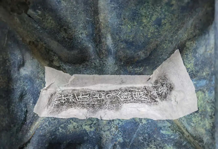 在制作拓片时,并不是所有铭文都在器外人们视线所及之处。在此次展出的青铜器中,很多器物铭文位于器盖内部,有些铭文位于器底。这时,拓印就类似于“盲操作”。