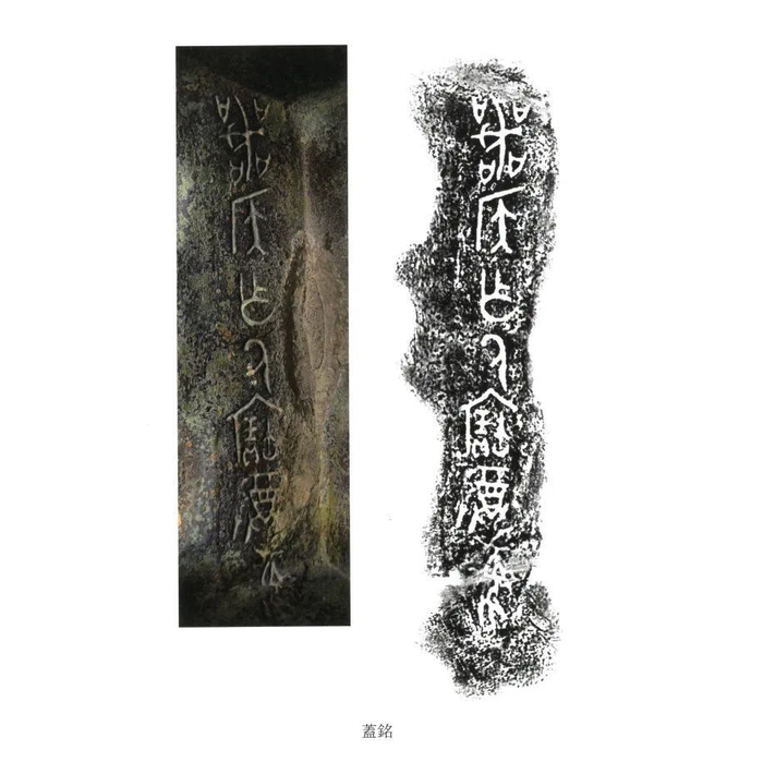 在中心柜中展出的这件“噩候方罍”,是拓片铭文很有趣的一件。在展厅中可以看到,它的器盖拓片铭文最后是带有一条白线。这是因为方罍的盖铭在盖内顶部两个面上,中间有一个折角,上墨时折角处受墨最少,所以拓印出来就呈现出一条空白线条的形态。通过观看拓片观众可以更方便了解器内铭文的位置。