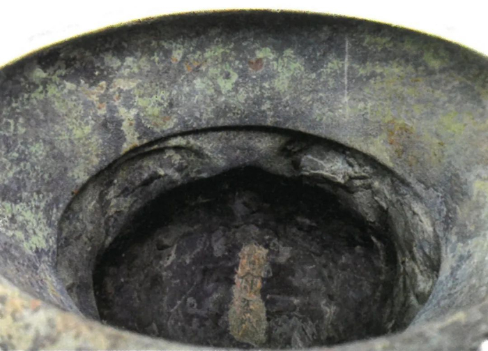 另外,这件卣采用了“等壁厚”的设计。观察器物的内壁可以看到,从外面看上去比较突出的部位,内壁则是向外凸出的,尽量保持了壁厚的一致性。这是由于铜、锡、铅青铜合金的结晶温度范围比较宽,在铸造器物的时候,如果壁厚相差比较大,就可能会产生比较多的缺陷、或者使得铸造不容易成功。在铸造时保持器壁厚度均匀一致,这也是噩国青铜器的一个特色。