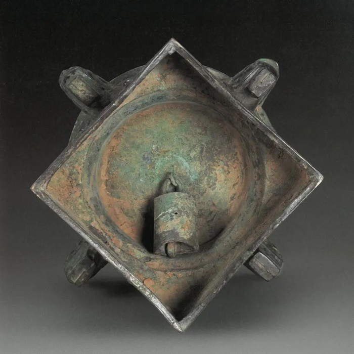 在这里给大家看一下噩侯簋,倒过来后它的底足内部是方形的,而上方则是圆形的,在圆形中央悬挂了一个铃铛,构思精妙奇巧。