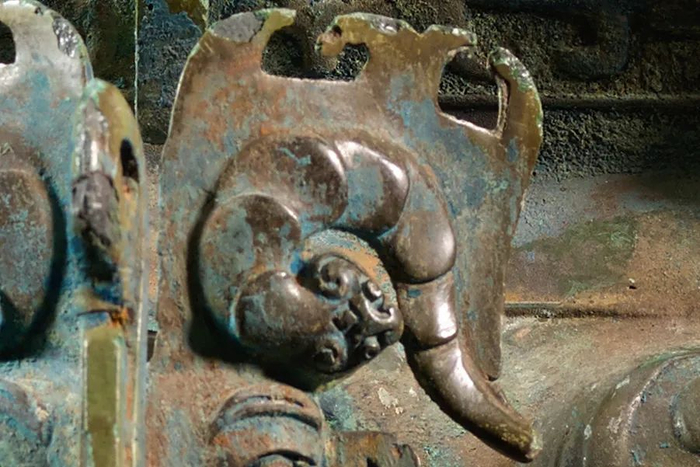 另一个体现制作严谨性的细节是象首。事实上,象首是非常复杂的附件,难以一次铸造完成,因此采用了“分铸铸接”技术。象首的内部原本也留有大块泥芯,但这些泥芯后来全部被一点一点地挖干净了,象首内的空腔在铸接时被重新填满了青铜液。这与当时普通青铜器的铸接结构是完全不同的,因为铸接时一般只需要将口上的泥芯挖去很少一些就足够了。运用x-ct技术真实地呈现出这些制作上的细节,不仅反映了当时工匠的制作理念,也体现了制作技术的地域特征及差异。
