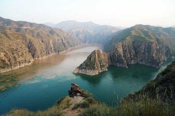 黄河静卧在刘家峡水库,波纹层层,金光闪动,水绿得如茵,蓝得似宝,绿蓝交汇处,让人记起“春来江水绿如蓝”的诗句来。洮河之水悄然汇入,却显得格格不入了,不过洮河算是找到了大家庭。洮河在这里不再是小家碧玉,也不是大家闺秀,而是一股浑浊的黄泥汤。相汇处,像把一桶黄油倒入一摊碧水中,像两种难以调和的颜料。这两种难以调和的颜料经千回百转,反复糅合、渗透,于峡谷中漂流,最后才不见了浑浊,于盛大之水库中完全融为一体。