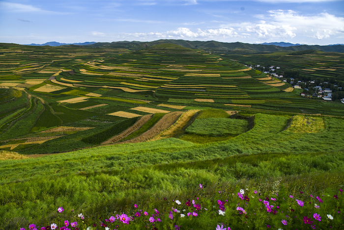 甘肃省甘南藏族自治州卓尼县,层层叠叠的梯田交相辉映,构成一幅大自然的山水画。 视觉中国 图