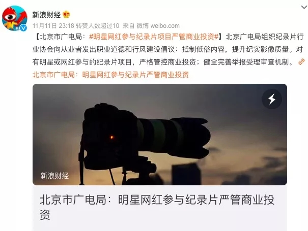 一个值得注意的点在于,就在明星、网红快速涌入纪录片市场的当下,监管也在随之而来。日前,北京局组织纪录片行业协会向从业者发出职业道德和行风建设倡议,指出要抵制低俗内容,提升纪实影像质量,并着重强调“对有明星或网红参与的纪录片项目,严格管控商业投资”。政策带来的变化同样值得关注。