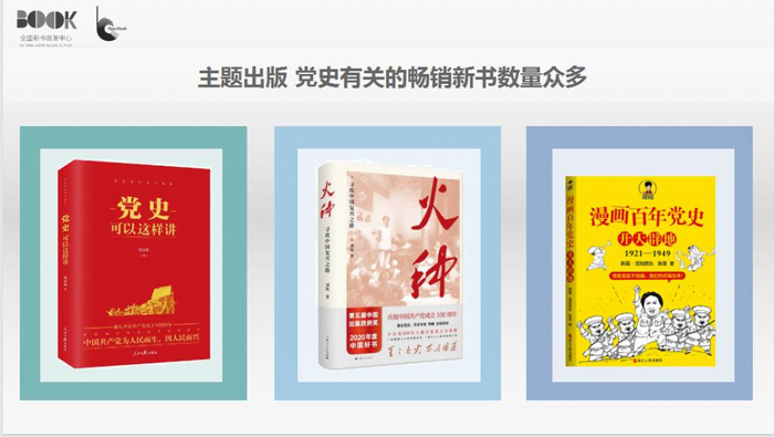 主要因为今年是建党 100 周年,党史相关图书是市场热点,在大众图书市场也有大量相关图书应运而生,如《党史可以这样讲》《火种 : 寻找中国复兴之路》《漫画百年党史 - 开天辟地》等。