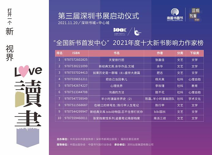11 月 20 日,在第三届深圳书展启动仪式中,全国新书首发中心联合北京开卷信息技术有限公司发布了《2021 年全国新书市场报告 ( 1-10 月 ) 》,同时也公布了 "2021 年度十大新书影响力作家榜 "。