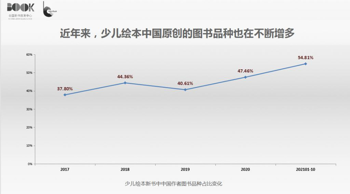 近年来,零售市场销售的新书品种中,中国作者的图书品种占比不断提升,2021 年 1-10 月达到 88.53%。多年来国家一直高度重视原创精品图书的出版工作,尊重原创出版的良好风尚已逐渐成为出版界的自觉追求。在大众图书领域,除文学、经济与管理等原本即以原创品种为主的类别外,在少儿绘本等原本以引进版图书为主的类别中,近年来中国作家原创的图书品种也在不断增多,并取得优异的销售成绩。2021 年 1-10 月,少儿绘本类新书中,国内原创图书占到 54.81% 的品种,为该类贡献 67.17% 的码洋,出现了《学会管自己 : 儿童自律能力培养系列故事绘本 ( 全 8 册 ) 》《小羊上山儿童汉语分级读物》、" 爱国主义教育绘本 " 系列等各种畅销作品。