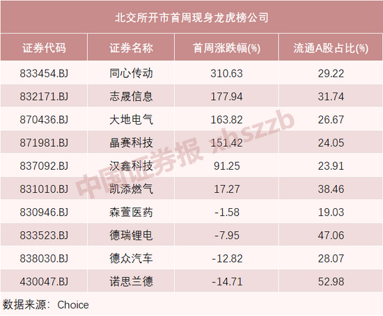 开市首周,共有10只北交所股票符合交易公开信息(俗称“龙虎榜”)披露要求,其中次新股5只,精选层平移股票5只。同心传动上榜3次,志晟信息、大地电气各上榜2次。这3只股票均是次新股,本周分别上涨311%、178%和164%,系北交所开市首周涨幅前三股票。