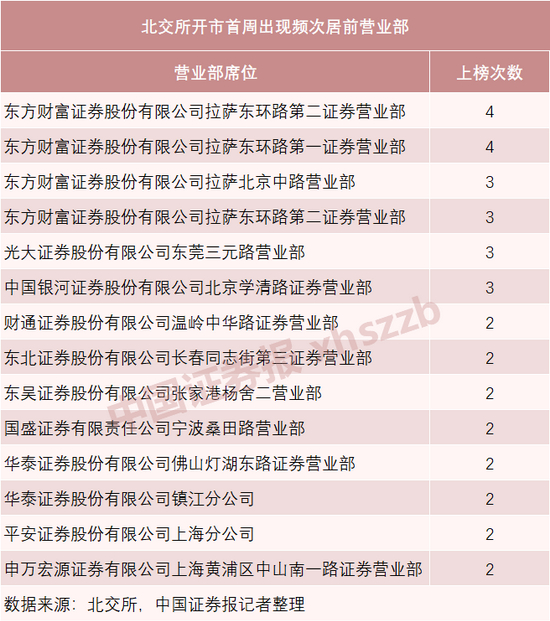 首周共有114个席位现身北交所龙虎榜,其中营业部席位111个,机构席位3个。东方财富证券拉萨地区的四个营业部累计上榜13次,光大证券东莞三元路营业部和银河证券北京学清路证券营业部各上榜3次。值得注意的是,诺思兰德、森萱医药两只精选层平移股票获机构席位买入,买入金额均为430万元,而次新股志晟信息被一机构专用席位卖出422万元。