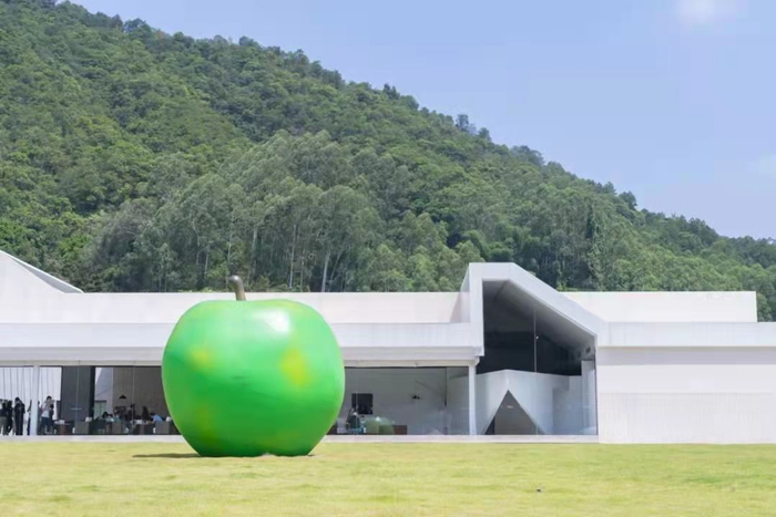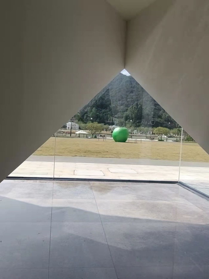 走进小镇,河边,首先映入眼帘的就是日本著名的建筑师、清水混凝土诗人安藤忠雄的作品:“诗之礼堂”,礼堂前面的草坪正中央是象征着“永远的青春”的安藤忠雄的青苹果。