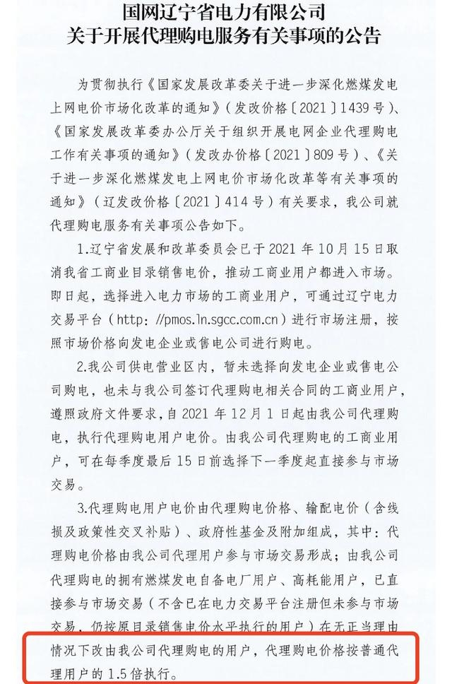 10月28日,国网辽宁省电力有限公司发布《国网辽宁省电力有限公司关于开展代理购电服务有关事项的公告》显示,提出取消省工商业目录销售电价,推动工商业用户都进入市场。代理购电的拥有燃煤发电自备电厂用户、高耗能用户,代理购电价格按普通代理用户的1.5倍执行。
