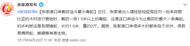 这不是张家港口岸第一次发现毒蛇:2017年,张家港出入境检验检疫局在对一批来自赞比亚的木材进行查验时,截获一条1.5米以上的毒蛇。当时,提到是“张家港口岸截获的迄今最大毒蛇”。
