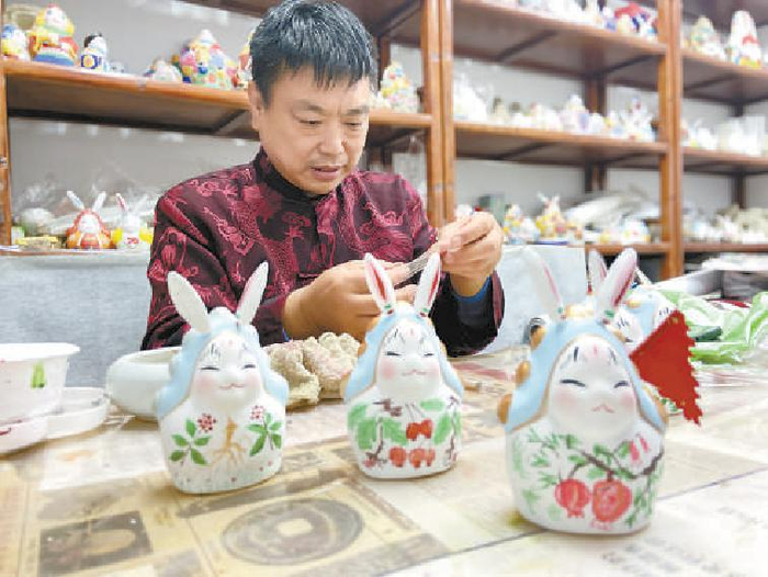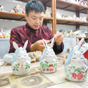 “呦,这兔儿爷挺有意思,背后真‘开窗’了,还散发着阵阵草药香气……”在白塔寺文创商店里,一尊新上的兔儿爷吸引了不少游客的注意。这是泥彩塑兔儿爷第五代传人张忠强与白塔寺药店跨界合作推出的一套新式兔儿爷。在这一套共5尊呆萌的兔儿爷上,分别画了人参、山楂、石榴、佛手瓜、金银花五味草药,而每尊兔儿爷的背部也都被“开了窗”,透过这个白塔寺形状的小窗,装入了药店自制的包含金银花、冰片、藿香等十几味草药的药包。