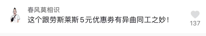 对于这样的“刷1万减1分”的优惠幅度,有网友表示“这个跟劳斯莱斯5元优惠券有异曲同工之妙!”“我看着手里上次推销送的玛莎拉蒂的百元抵用券,瞬间觉得挺感动的”。