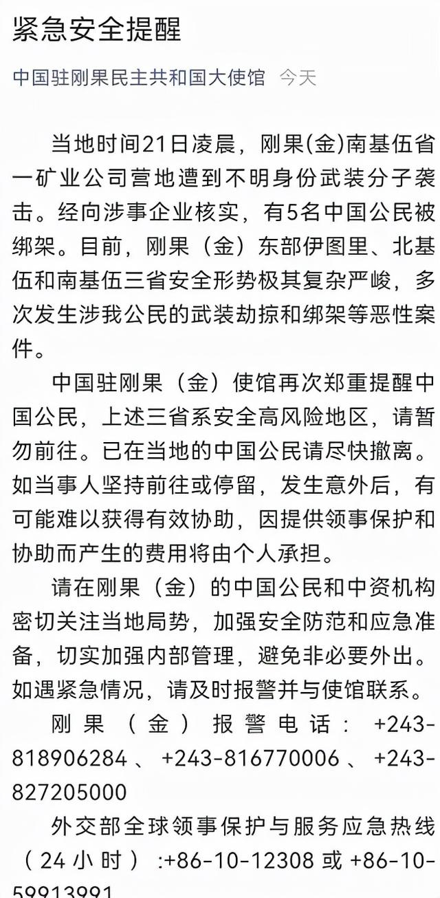 当地时间11月21日下午,驻刚果(金)使馆发布紧急安全提醒称,当地时间21日凌晨,刚果(金)南基伍省一矿业公司营地遭到不明身份武装分子袭击。经向涉事企业核实,有5名中国公民被绑架。目前,刚果(金)东部伊图里、北基伍和南基伍三省安全形势极其复杂严峻,多次发生涉我公民的武装劫掠和绑架等恶性案件。