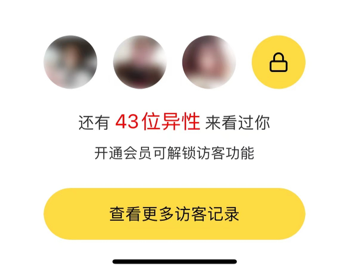注册虽然方便,却不等于接下来可以顺畅使用。在某款软件内,化身为“61岁、男性”的记者收到提示,“43位异性来看过你”。点击却发现,她们的头像都是虚化状态,同时跳出弹窗称,“开通会员可解锁访客功能”。价格为每月30元,直接开通一年则优惠至98元。