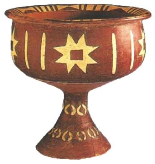 八角星纹彩陶豆是这一时期的盛食器,现藏于山东博物馆。它口径26厘米、足径14.5厘米、通高28.4厘米,用经过筛洗的细泥红陶制作而成,上部的豆盘为圆唇斜口、深腹,底部为喇叭形高圈足,造型规整匀称。陶豆采用彩陶工艺装饰,器表先施一层白色陶衣,其上用褐、红等矿物染料绘成图案,图案为八角星纹。圈足部位施两周褐色彩带,彩带之上绘几何纹样,几何纹样由两条相对的弧线构成,每个圆弧纹很像一个圆括号。
