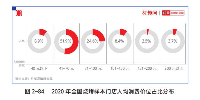 据红餐品牌研究院统计,人均消费在41~70元的烧烤品牌占据了半壁江山,比例达到了51.9%,71~100元的烧烤品牌占到了24.6%,而客单价40元以下以及100 元以上的烧烤品牌占比低,只占了8.9%和14.6%。可见,烧烤市场呈现出典型的纺锤状发展形态,中端烧烤品牌居多,低端和高端品牌偏少。