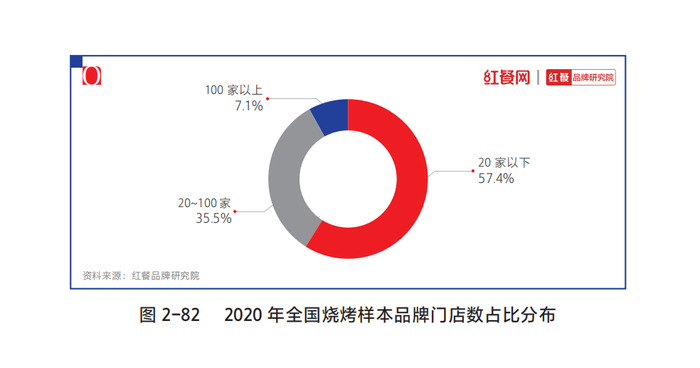 尽管当下全国烧烤门店已经突破34万家。但门店数在 100 家及以上的烧烤品牌占比仅为 7.1%。从“2021十大烧烤品牌”上榜的头部品牌来看,除了木屋烧烤超过百家门店以外,其余品牌的门店数量,大都在50家左右徘徊。