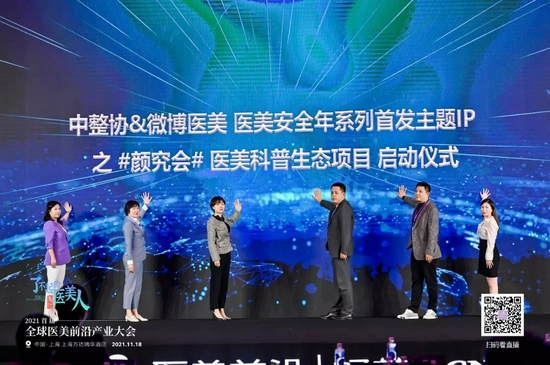 大会上,四环医药渼颜空间新品事业部总经理孙超,战略合作伙伴HUGEL-韩国秀杰(上海)医药科技有限公司品牌总监张瑜与中国整形美容协会靖宣主任,微博泛生活运营部总经理李梁,医美综艺《女魔头驾到》、医美媒体《医与美前沿》、医美医生IP《郝格和她的医生朋友》好美MCN 创始人郝格,北京梅颜医疗美容诊所创始人刘红梅院长上台,共同举行“中整协&微博医美 医美安全年系列首发主题IP之#颜究会#医美科普生态项目启动仪式”。
