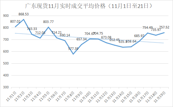 不过随着时间的推移,广东电力现货实时成交均价出现了一定的下降趋势。截止11月15日,单日现货实时成交均价最低还达到了577.39元/MWH,几乎接近了上涨20%后的燃煤发电上网电价(553.6元/MWH)。