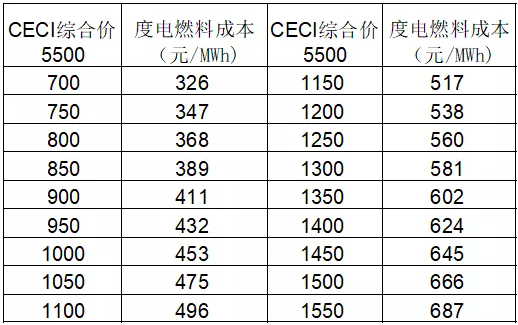 根据中国沿海电煤采购价格指数(CECI沿海指数),第179期(10月28日至11月4日)的5500综合价格为1220元/吨,第180期(11月4日至11月11日)的5500综合价格为1095元/吨,第181期(11月11日至11月18日)的5500综合价格为983元/吨。也就是说沿海60万机组的度电燃料成本大约在500元~600元/MWH左右。