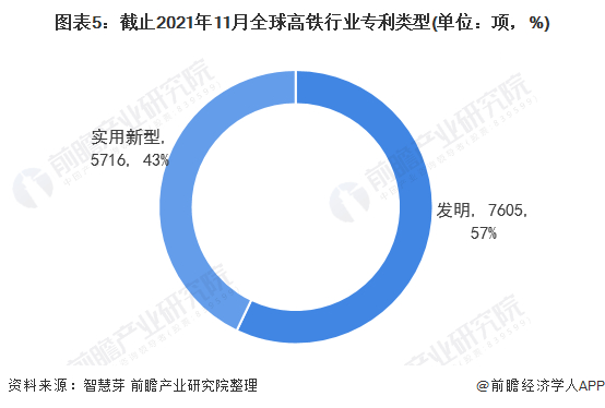 在专利类型方面,目前全球有7605项高铁专利为发明专利,占全球高铁专利申请数量最多,为57%。实用新型高铁专利数量为5716项,占全球高铁专利申请数量的43%。