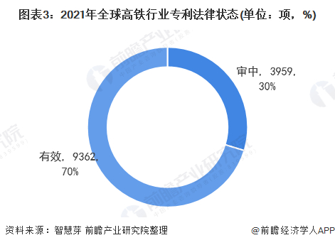 目前,全球高铁专利均处于“审中”和“有效”状态,两者高铁专利总量分别为3959项和9362项,占全球高铁专利总量的30%和70%。