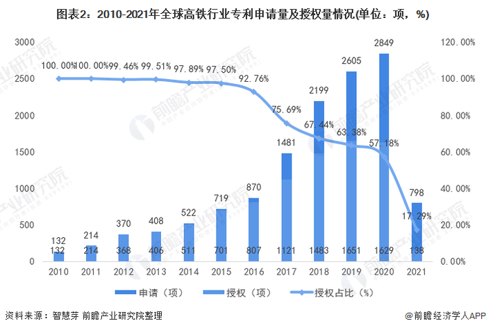 在专利授权方面,2010-2019年全球高铁行业专利授权数量逐年增长,2020年开始出现下降趋势,2020年全球高铁行业专利授权数量为1629项,授权比重达57.18%。