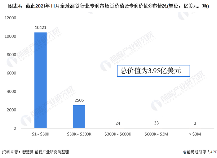 目前,全球高铁行业专利总价值为3.95亿美元。其中,3万美元以下的高铁专利申请数量最多,为1.04万项;其次是3万-30万美元的高铁专利,合计专利申请量为2505项。3百万美元以上的高铁专利申请数量最少,为3项。