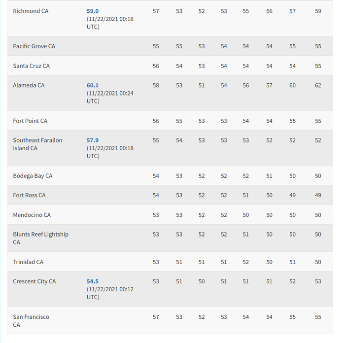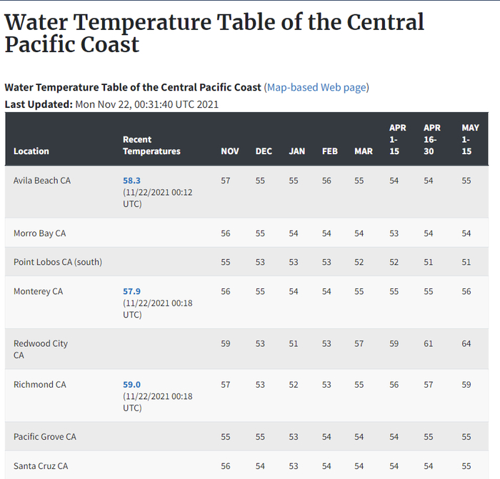 其次,11月的太平洋海水水温已经偏低。据美国国家海洋和大气局(NOAA)官网发布的监测数据,往年11月,中太平洋海岸靠近各海滩的平均水温在53℉-59℉(11℃-15℃)之间。且不论人体是否能在此水温中耐受,队伍中有部分人仅穿卫衣和长袖T恤在海水中神情自如地排队,不合常理。