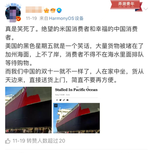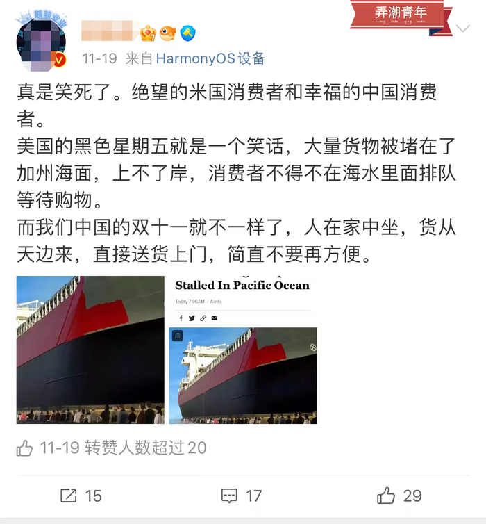 11月19日,微博上流传一则消息称,随着美式“双十一”黑色星期五临近,大量进口货物被堵在加利福尼亚州海面上不了岸,美国消费者们不得不在海水里排队等待购物。