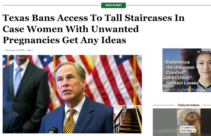 熟悉美国文化的读者可能了解,ONN在美国是一家以提供“讽刺新闻”(satire)闻名的新闻网站,2007年上线,拥有可与美国有线电视新闻网(CNN)匹敌的全线专业报道团队,其风趣幽默且辛辣讽刺的报道风格在美国颇受大众喜爱。该网站在18日发布的一则“新闻”标题是《得克萨斯州禁止人们靠近长楼梯以防意外怀孕的女性想不开》。