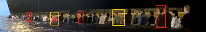 再仔细看一眼图片,还会有更加令人咋舌的发现。原图中,一位身穿棕色外套、戴着白色围巾的女士(下图红框内人物),在图片中总共出现了三次。另有一位身穿卫衣的男士(下图黄框内人物),尽管被换了衣服颜色,但从身形姿态看还是能够判断出这是同一个人。看起来,“洋葱”新闻在呈现“排队的人群”时似乎也犯了懒,对图片中部分人物做了简单的复制粘贴处理。
