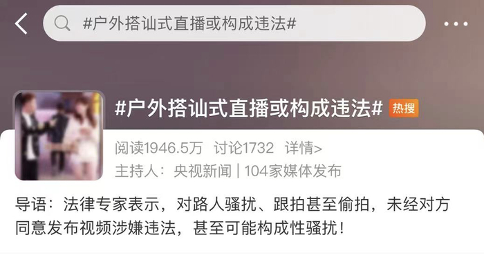 近年来,有关户外主播偷拍、搭讪骚扰路人引发案件纠纷的情况时有发生。