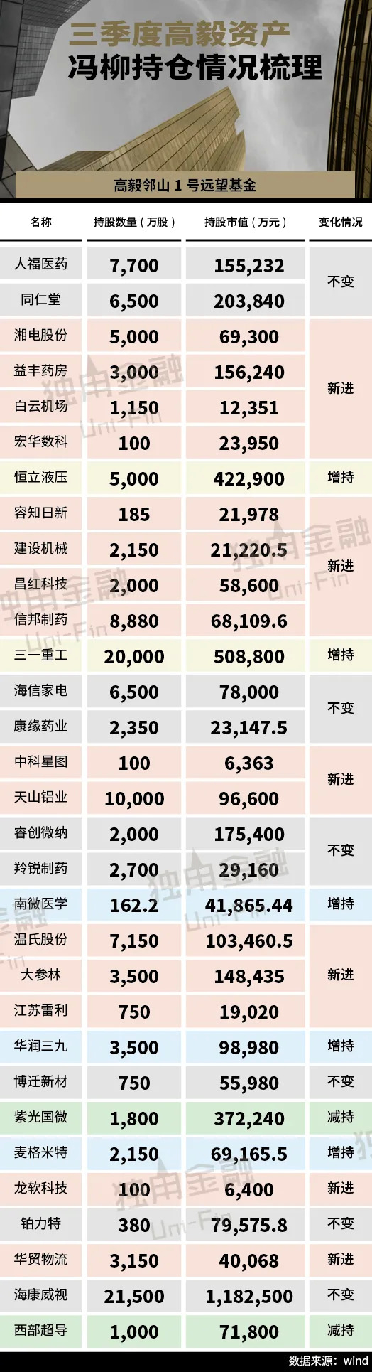 作为高毅资产的代表,在今年三季度中,冯柳执掌的“高毅邻山1号远望基金”出现在31家上市公司的前十大流通股东名单中,合计持股市值高达442亿元。冯柳在三季度新进15只个股,其中有4只科技股和3只医药股;对原有持仓的5只个股进行了加仓,减仓了2只个股。
