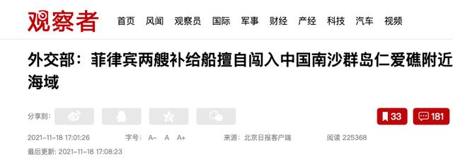 但如果是其他国家,比如菲律宾11月16日在仁爱礁进行可能的设施建设,有可能要加固仁爱礁,这背后有美国因素,再加上菲律宾是美国的盟友,中国处置起来可能还不是简单的中国和菲律宾之间的关系,并不是菲律宾试图改变现状、中国予以阻止这么简单。越南的情况也是如此,近期越南也有动作表明其在南沙群岛部分岛礁上进行扩建等等。