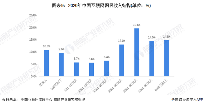 截至2020年12月,月收入在2001-5000元的网民群体占比为32.7%;月收入在5000元以上的网民群体占比为29.3%;有收入但月收入在1000元及以下的网民群体占比为15.3%。