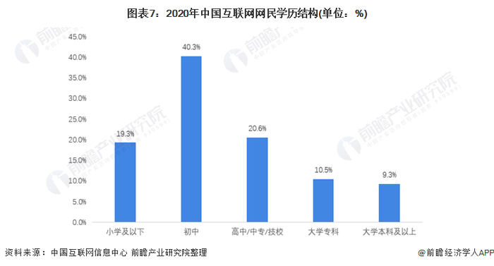 截至2020年12月,初中、高中/中专/技校学历的网民群体占比分别为40.3%、20.6%;小学及以下网民群体占比由2020年3月的17.2%提升至19.3%。